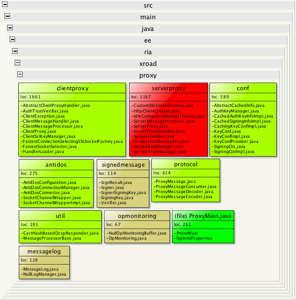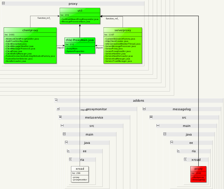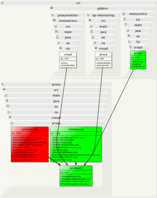 Here we have a single view telling me that when I do changes in proxy protocol, there's the risk of breaking the proxymonitor, op-monitoring and metaservice addons. Obviously I have to ensure these components get tested well enough to avoid regression. Also proper unit testing for the serverproxy and clientproxy components within the proxy package is required.