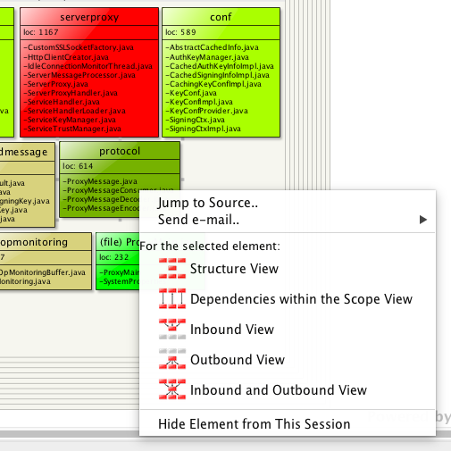 However, I'm often interested about the details too: what actually makes the dependency between two elements? For that I can adjust the detail level by pressing the "+" button until I get to see enough details. Here's an example for the proxymonitor -> util dependency: