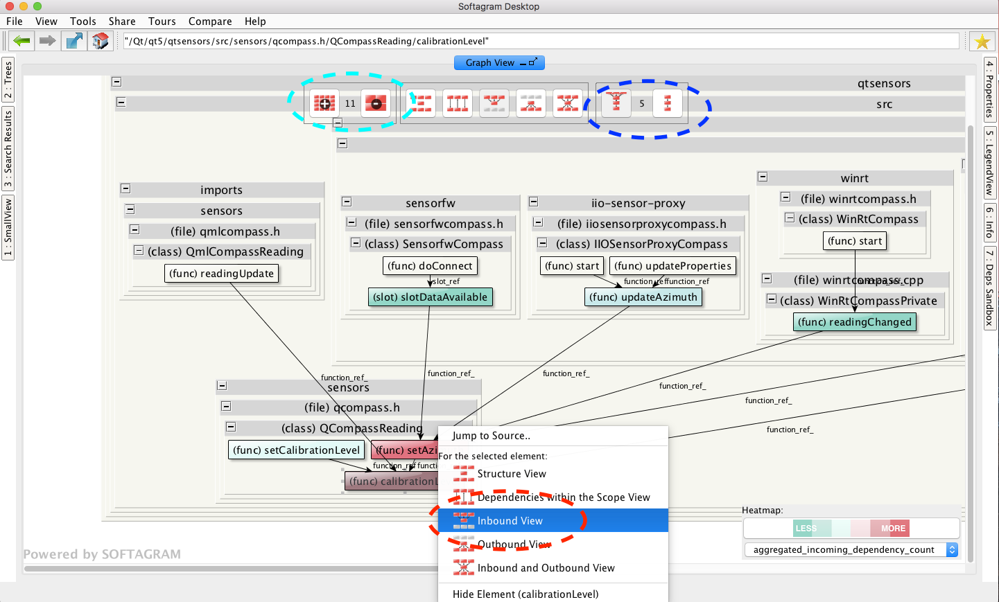 E.g. in the example above, searching again for "CalibrationLevel" would give me the graph of all functions named "CalibrationLevel" (instead of just the one we looked at above), showing their users and possible refactoring targets: