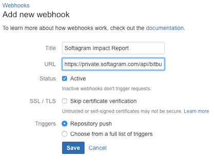 For each repository to be analyzed, Softagram adds a new webhook in repository settings in Bitbucket. If this didn't work for you, you can add the webhook yourself like this: