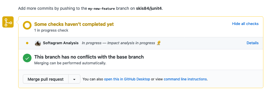 Softagram analysis will start after you have created your pull request. In GitHub, you can see the progress of the analysis from the Checks view.